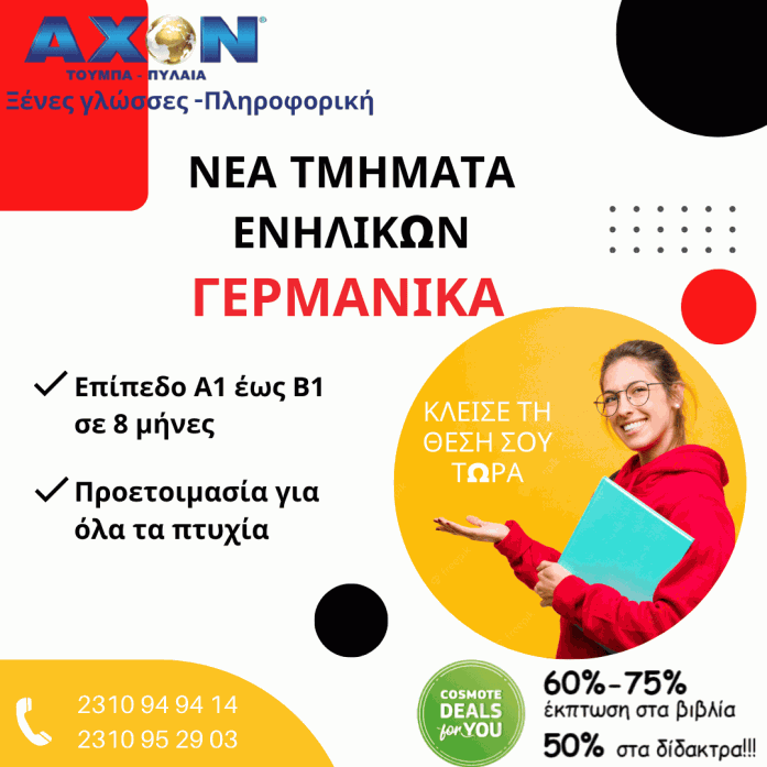 Προλάβετε την προσφορά μας με 50% ΕΚΠΤΩΣΗ στα δίδακτρα. Για Γερμανικά εμπιστευτείτε μόνο τους ειδικούς. Καθηγητές με πολύχρονη εμπειρία και στα διαδικτυακά μαθήματα σε όλη την Ελλάδα στα μεγαλύτερα Κέντρα ξένων γλωσσών Αγγλικών, Γερμανικών & Πληροφορικής στην καρδιά της Τούμπας και στην Πυλαία.