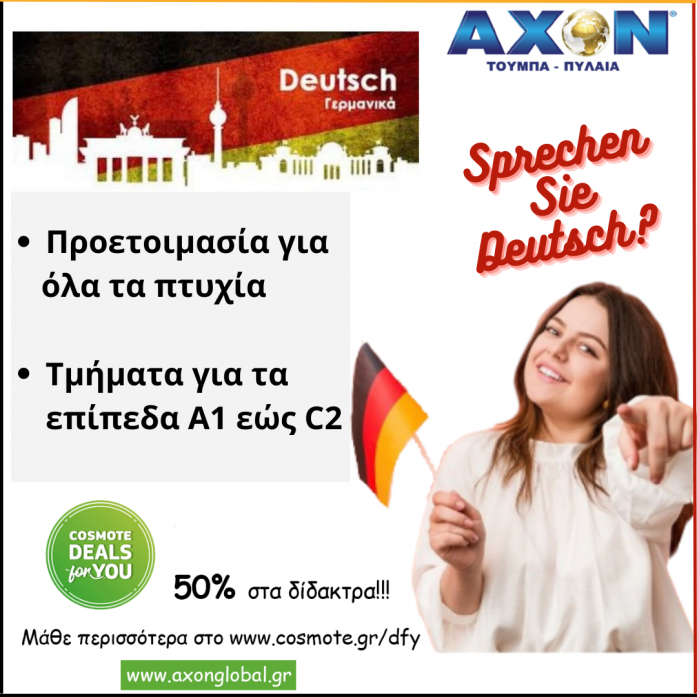 Νέα τμήματα γερμανικών για το 2022. Προλάβετε την προσφορά μας με 50% ΕΚΠΤΩΣΗ στα δίδακτρα. Για Γερμανικά εμπιστευτείτε μόνο τους ειδικούς. Καθηγητές με πολύχρονη εμπειρία και στα διαδικτυακά μαθήματα σε όλη την Ελλάδα στα μεγαλύτερα Κέντρα ξένων γλωσσών Αγγλικών, Γερμανικών & Πληροφορικής στην καρδιά της Τούμπας και στην Πυλαία.