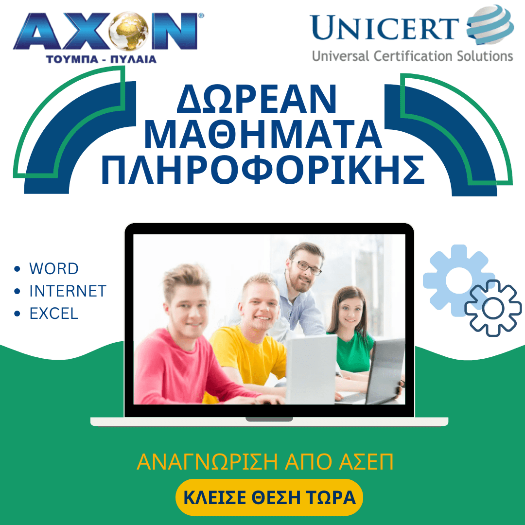ΔΩΡΕΑΝ μαθήματα εκμάθησης βασικών δεξιοτήτων πληροφορικής (Office) για την απόκτηση αναγνωρισμένων πιστοποιητικών από εξεταστικό φορέα του Ε.Ο.Π.Π.Ε.Π. (Υπ. Παιδείας) για όλες τις προκηρύξεις εργασίας και ΑΣΕΠ.